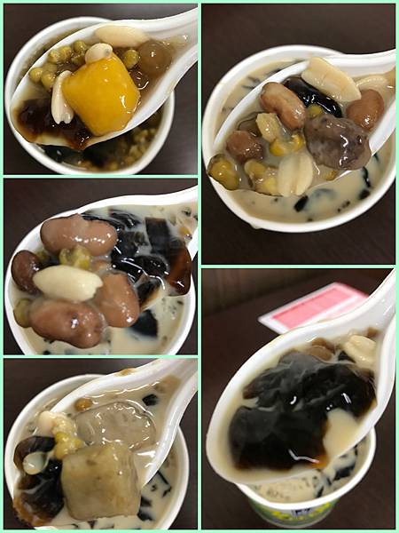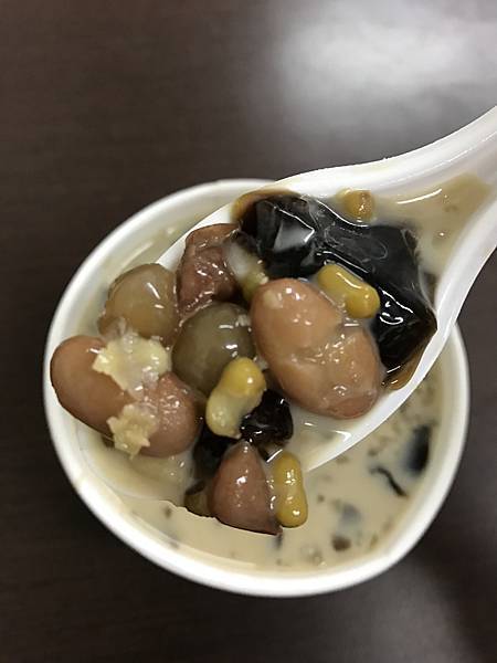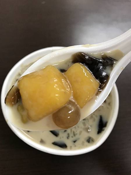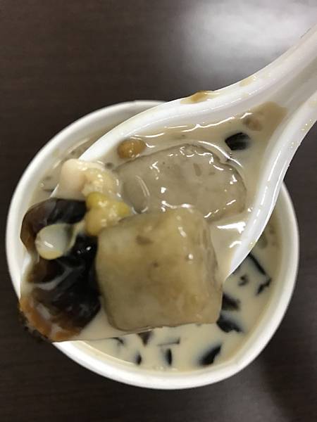 將湯匙深入挖寶後,配料除了一開始看到的綠豆薏仁,還有花生仁、番薯圓、芋圓、紅豆QQ圓、綠豆QQ圓、花豆、粉圓,搭配著主角仙草凍,看來勢均力敵,誰也不輸誰。不多說,先舀一口仙草凍,吸入口中,口感滑嫩咕溜,帶有微苦甘甜味,再來嚐嚐芋圓與QQ圓,真的很Q,好好吃,值得讚賞,花生仁、花豆也很入味。雖然一碗要60元,點的時候內心也嘀咕了幾聲不便宜,但吃完後,覺得用料豐富且真材實料,值得。