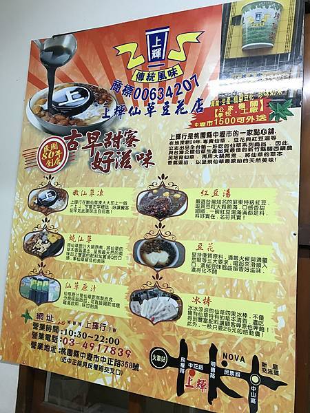 大感動食評:2/21中午與客戶約在中壢休息區碰面,吃了一頓午餐後,心血來潮就順道到中壢市區繞繞,開到中正路看到了一個大杯子,不就是上輝仙草豆花嗎?那可是中正路有名的地標啊。雖然在桃園中壢混了不少年,但不知道為什麼,就是沒進去吃過,趁著今天天氣熱,車也好停,進去嚐一嚐鮮。
